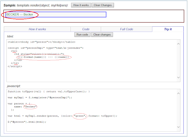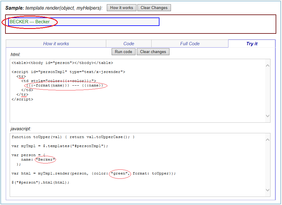 The sample is live. You can click on Try it and change anything you want: - the template, the data, or the code. For example if you change each of the places I have circled in red -